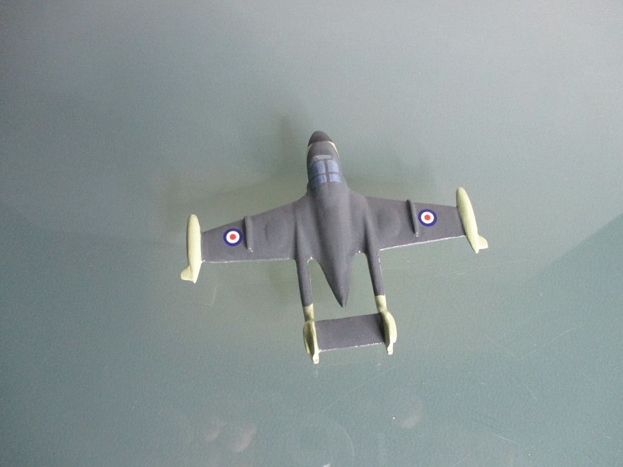 Il avait juste besoin d'un petit coup de couleur alu en dessous (pour supprimer le bleu qui n'avait rien à y faire...) et sur les pylônes (pour ne laisser que les missiles en blanc), puis repeindre le nez en noir pour être conforme à la photo, et bien sûr modifier les décalques.